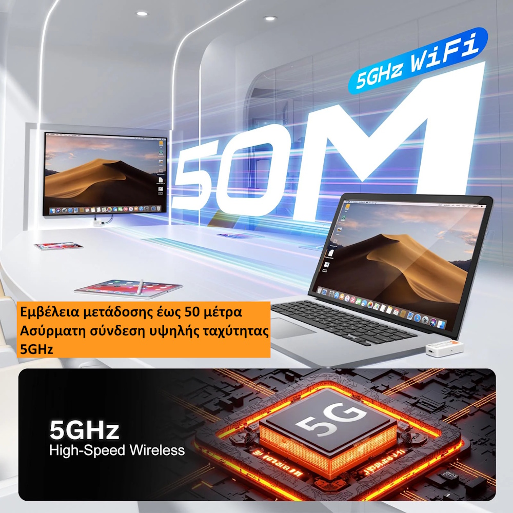 Το σύστημα υποστηρίζει χαμηλή καθυστέρηση κάτω από 100ms, γεγονός που το καθιστά ιδανικό για gaming, streaming ή επαγγελματικές παρουσιάσεις. Επιπλέον, η μετάδοση μπορεί να φτάσει έως τα 50 μέτρα σε ανοιχτό χώρο, προσφέροντας ευελιξία σε κάθε χώρο ή χρήση.