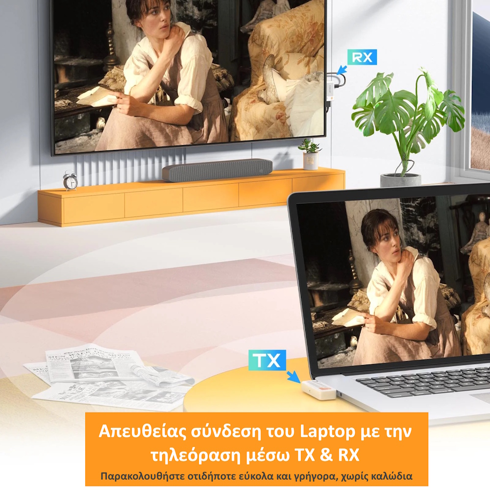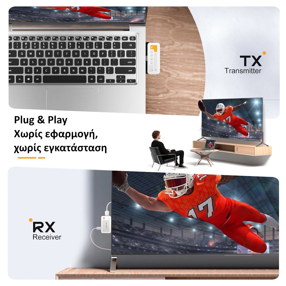 Η λειτουργία του είναι Plug & Play, πράγμα που σημαίνει ότι δεν χρειάζεται καμία εγκατάσταση λογισμικού ή επιπλέον ρυθμίσεις. Απλώς συνδέεις τον πομπό Type-C στη συσκευή σου και τον δέκτη HDMI στην τηλεόραση ή στον προβολέα. Σε λίγα δευτερόλεπτα, η εικόνα και ο ήχος μεταδίδονται ασύρματα με μηδενικό lag.