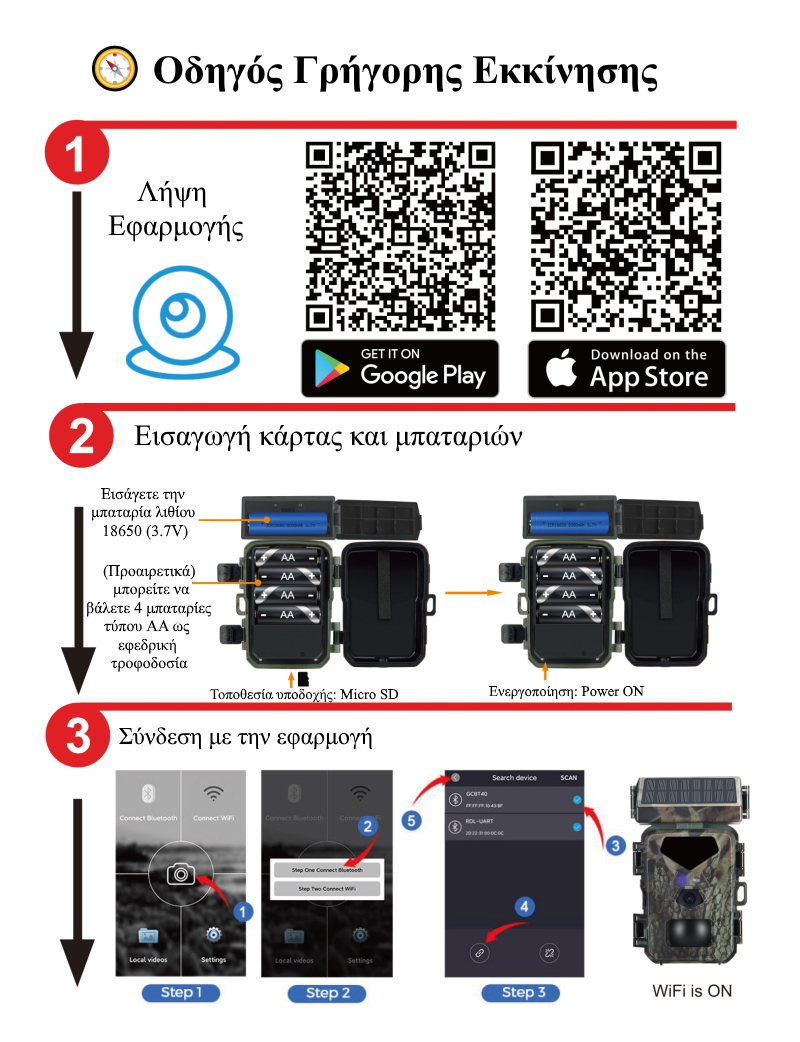 Όχι, δεν περιλαμβάνεται μπαταρία. Η κάμερα λειτουργεί με 1x18650 ή 4xAA μπαταρίες, καθώς και με ηλιακό πάνελ (συμβατό).