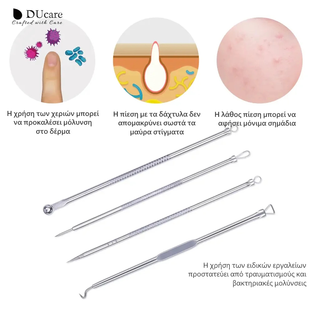 Τα Εργαλεία για μαύρα στίγματα DUcare F19 DermaCare Set προσφέρουν επαγγελματικό καθαρισμό προσώπου στο σπίτι, με ασφάλεια, ακρίβεια και υγιεινή. Κατασκευασμένα από ανοξείδωτο ατσάλι υψηλής ποιότητας, αυτά τα εργαλεία αφαιρούν αποτελεσματικά μαύρα στίγματα, λευκά στίγματα, σπυράκια και μικρές ατέλειες χωρίς να προκαλούν ερεθισμούς ή ουλές.