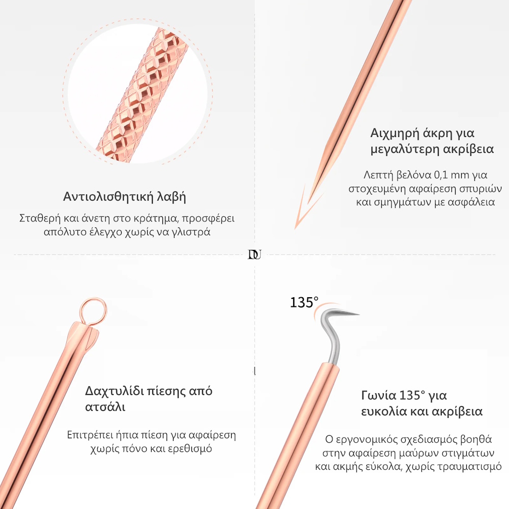 Πλήρες σετ εργαλείων περιποίησης δέρματος: Περιλαμβάνει διάφορα εργαλεία εξαγωγής για μαύρα στίγματα, λευκά στίγματα και σπυράκια.