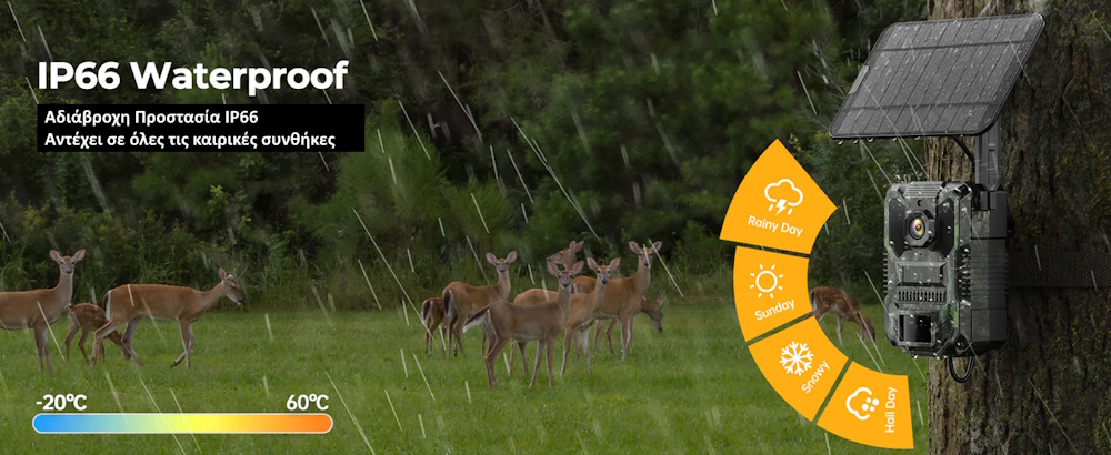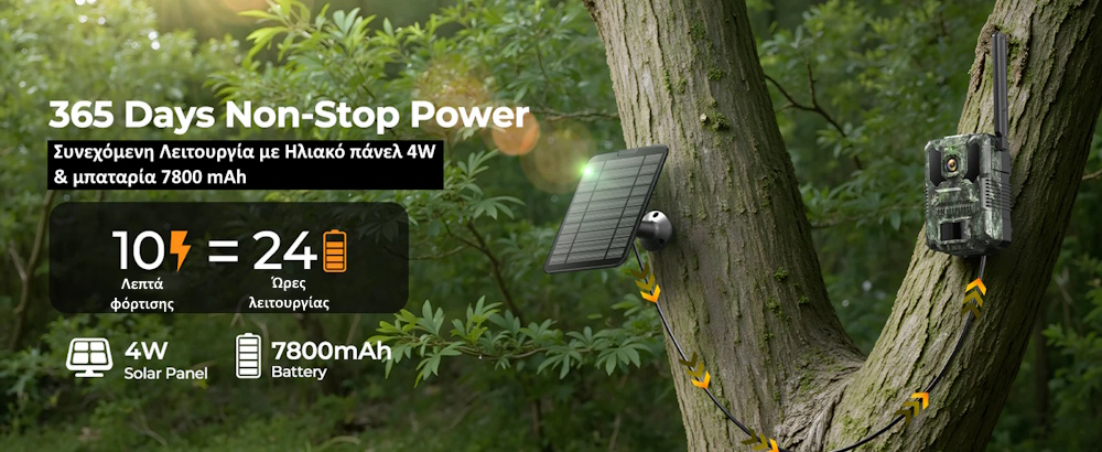 Το solar panel φορτίζει την κάμερα καθ’ όλη τη διάρκεια της ημέρας, προσφέροντας πραγματική αυτονομία σε απομακρυσμένες περιοχές και μειώνοντας τις ανάγκες για αλλαγή μπαταριών.