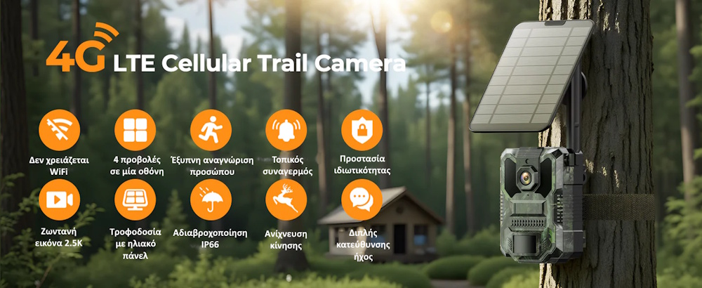 Η Campark TC36 συνδυάζει 2.5K live video, οπτικό ζούμ 10x, 4G συνδεσιμότητα, ηλιακή φόρτιση, νυχτερινή λήψη και ανθεκτικότητα IP66, αποτελώντας μία από τις πιο αξιόπιστες λύσεις παρακολούθησης για κυνηγούς και απομακρυσμένες περιοχές.