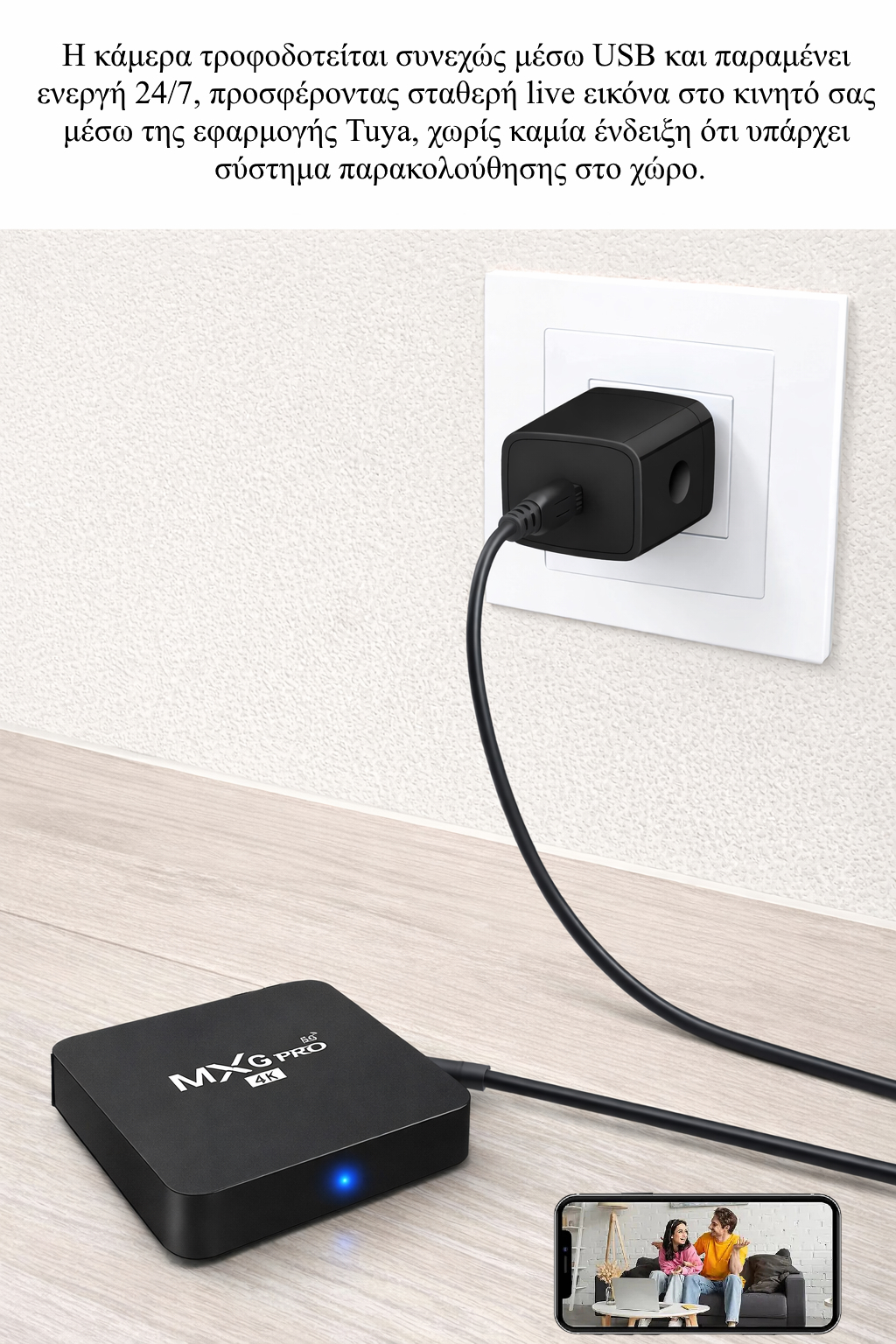 Το προϊόν αποτελείται από ένα ειδικά σχεδιασμένο κέλυφος τύπου TV Box, μέσα στο οποίο τοποθετείται το camera-module. Το εξωτερικό του είναι μαύρο, καθαρό, χωρίς κουμπιά, ενδείξεις ή φακούς – ιδανικό για τοποθέτηση σε ράφι, τραπέζι τηλεόρασης ή γραφείο χωρίς να κινεί υποψίες. Στο εσωτερικό του shell κρύβεται το micro-camera module, το οποίο συνδέεται με το τροφοδοτικό του και μένει πλήρως προστατευμένο, αθόρυβο και αόρατο.