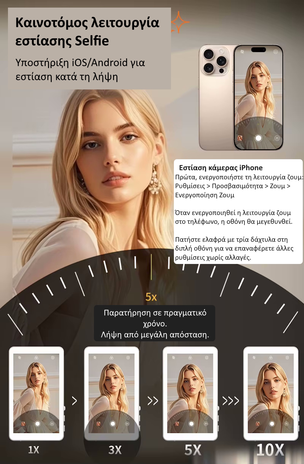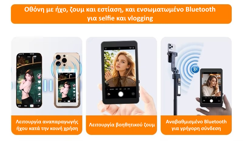 Η Μαγνητική Οθόνη Selfie για κινητά υποστηρίζει ρύθμιση zoom in/out με ένα απλό άγγιγμα. Επιπλέον, η οθόνη επιτρέπει προβολή της εικόνας σε πραγματικό χρόνο, ώστε να βλέπετε ακριβώς τι καταγράφει η κάμερα.