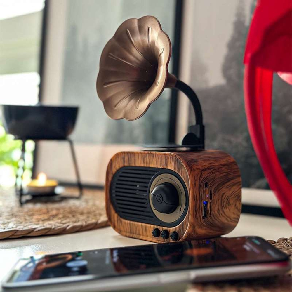 Το ξύλινο φινίρισμα σε συνδυασμό με τη μεταλλική κόρνα και τον αναλογικό επιλογέα ραδιοφώνου προσδίδουν μια αυθεντική vintage αίσθηση, ενώ η σύγχρονη τεχνολογία Bluetooth εξασφαλίζει εύκολη σύνδεση και καθαρή αναπαραγωγή.