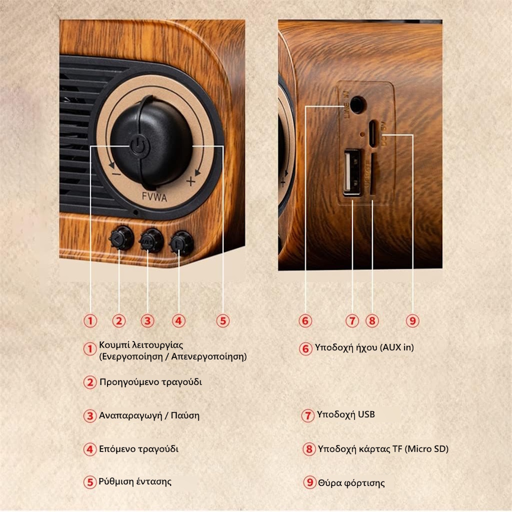 Το Old-school Bluetooth Ηχείο είναι ένας μοναδικός συνδυασμός ρετρό εμφάνισης και σύγχρονης απόδοσης. Με ασύρματη λειτουργία Bluetooth 5.3, FM ραδιόφωνο, USB, TF και AUX, παρέχει ευελιξία και ποιότητα ήχου σε κάθε χρήση. Η vintage αισθητική του το κάνει ξεχωριστό, ενώ η πρακτικότητά του το καθιστά απαραίτητο για όσους αγαπούν τη μουσική και τη διακόσμηση.