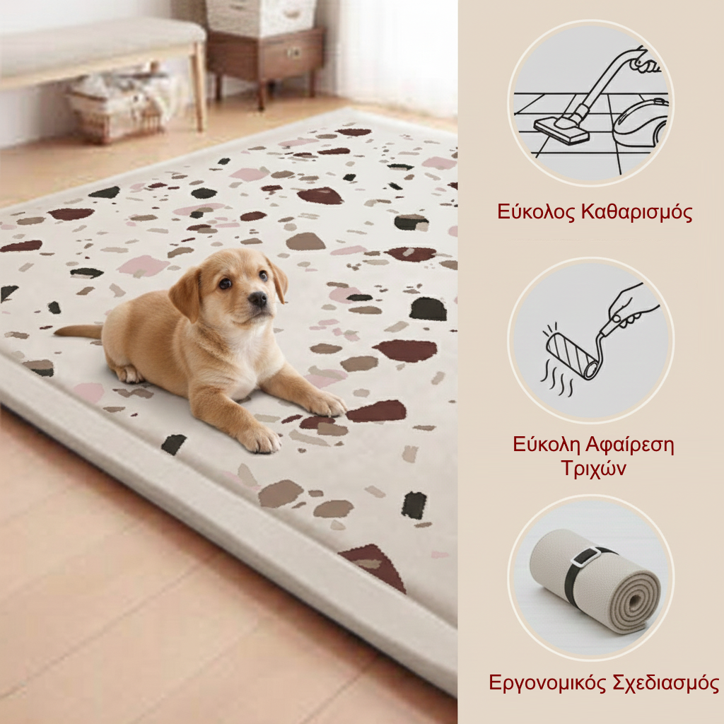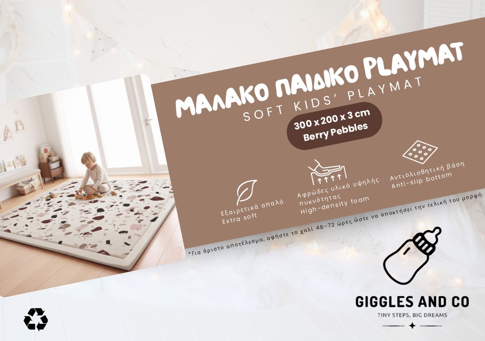 Το Παιδικό Προστατευτικό Χαλί Giggles & Co. “Berry Pebbles” έχει σχεδιαστεί ώστε να συνοδεύει το παιδί σε διαφορετικά στάδια ανάπτυξης. Από τα πρώτα στάδια του μπουσουλήματος έως το ελεύθερο παιχνίδι και τη χαλάρωση στο πάτωμα, προσφέρει μια ευχάριστη και σταθερή επιφάνεια που ενθαρρύνει την κίνηση και την εξερεύνηση του χώρου. Η μαλακή υφή του επιτρέπει στο παιδί να κάθεται ή να ξαπλώνει άνετα, δημιουργώντας ένα περιβάλλον όπου το παιχνίδι γίνεται πιο απολαυστικό και ξεκούραστο.