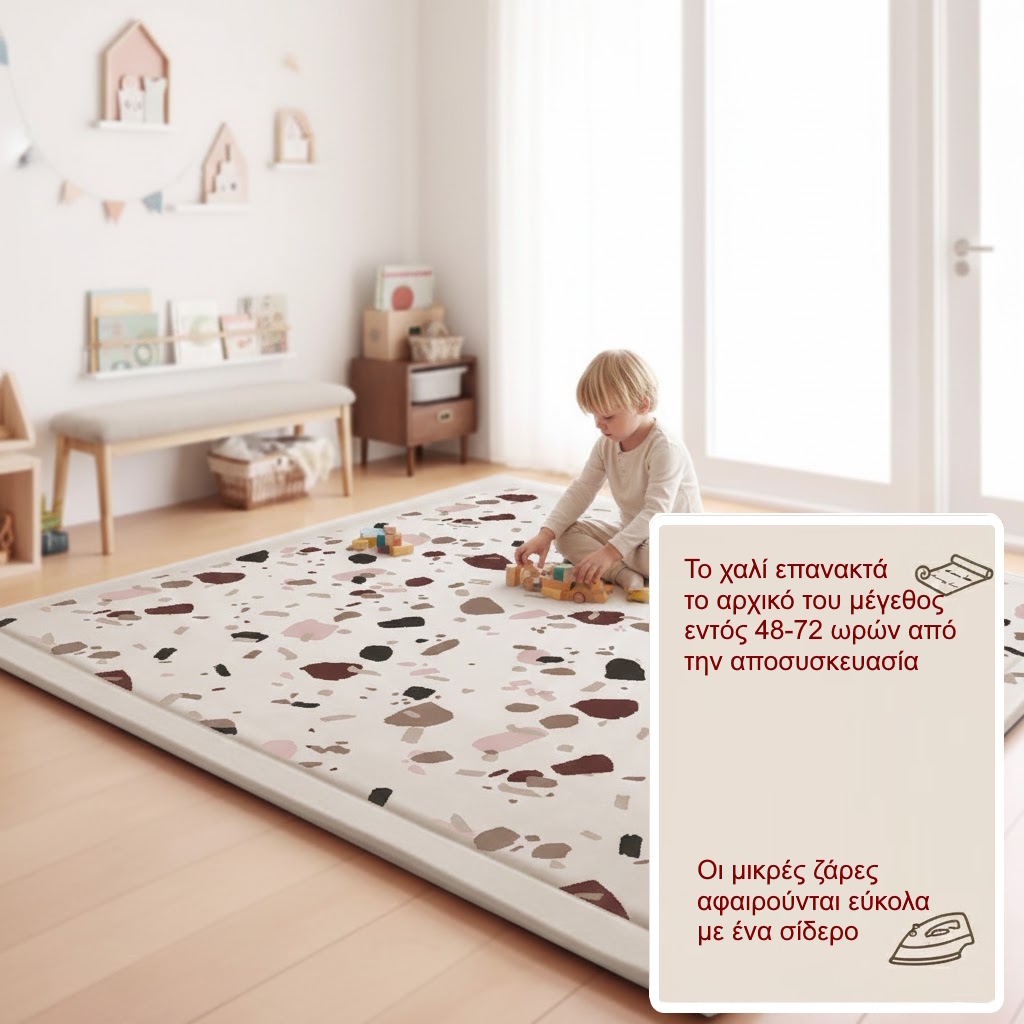Το Παιδικό Προστατευτικό Χαλί “Berry Pebbles” είναι σχεδιασμένο για να τοποθετείται απευθείας στο πάτωμα, δημιουργώντας ένα φιλόξενο περιβάλλον παιχνιδιού. Το αυξημένο πάχος συμβάλλει στην άνεση, ενώ βοηθά και στη μόνωση από το κρύο δάπεδο, κάτι ιδιαίτερα χρήσιμο τους χειμερινούς μήνες.