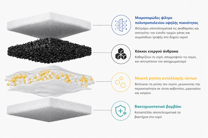 Το προηγμένο σύστημα φιλτραρίσματος πολλαπλών επιπέδων αφαιρεί τρίχες, σκόνη και άλλες ακαθαρσίες, εξασφαλίζοντας καθαρό και ασφαλές νερό για το κατοικίδιό σου. Παράλληλα, η συνεχής ροή νερού ενθαρρύνει τα ζώα να πίνουν περισσότερο, συμβάλλοντας στη σωστή ενυδάτωση και την υγεία τους.