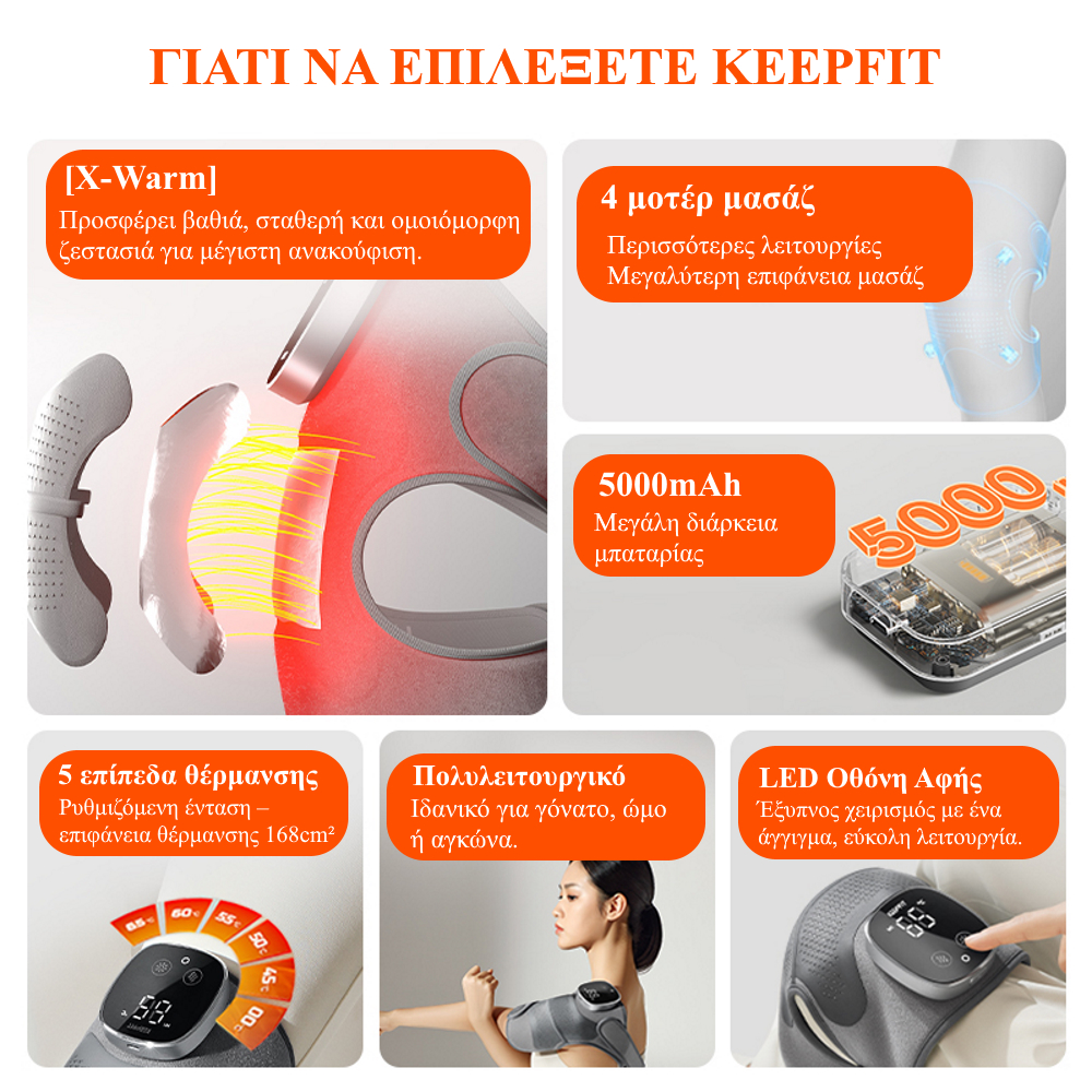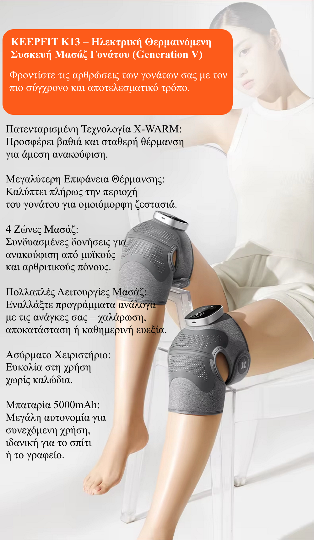 Συσκευή μασάζ για γόνατο iKeepFit KPF-knee13, ανακάλυψε την iKeepFit Συσκευή μασάζ για γόνατο, μια καινοτόμα λύση ανακούφισης και χαλάρωσης για πόνους στις αρθρώσεις, μυϊκή κόπωση και δυσκαμψία. Με τεχνολογία θερμότητας, δόνησης και εργονομικό σχεδιασμό, η συσκευή προσφέρει στοχευμένο μασάζ στο γόνατο, τον ώμο ή τον αγκώνα, βοηθώντας στη βελτίωση της κυκλοφορίας του αίματος και στην αποκατάσταση των μυών.