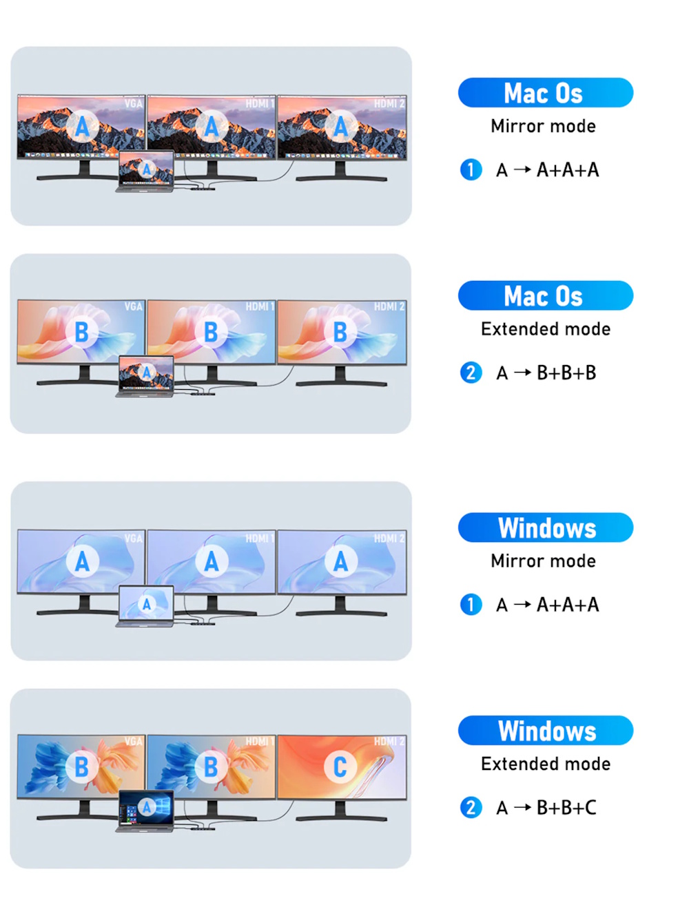 Dual 4K HDMI + VGA: Υποστήριξη δύο οθονών 4K στα 60Hz ή τριπλής οθόνης (2 HDMI + VGA) σε περιβάλλον Windows. Ιδανικό για επαγγελματίες που χρειάζονται πολλαπλές προβολές.