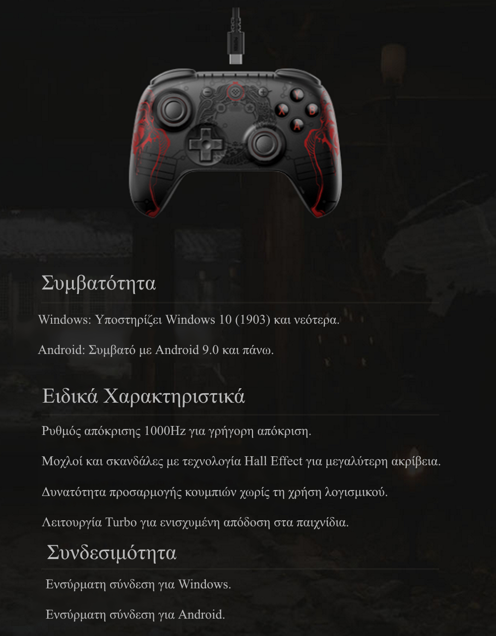 Το χειριστήριο είναι συμβατό με Windows 10 (1903) και νεότερες εκδόσεις, αλλά και Android 9.0 και πάνω, εξασφαλίζοντας απρόσκοπτη σύνδεση μέσω ενσύρματης λειτουργίας. Ο ρυθμός απόκρισης 1000Hz προσφέρει εξαιρετική ταχύτητα και χαμηλή καθυστέρηση, κάνοντάς το ιδανικό για γρήγορα αντανακλαστικά σε απαιτητικούς τίτλους.